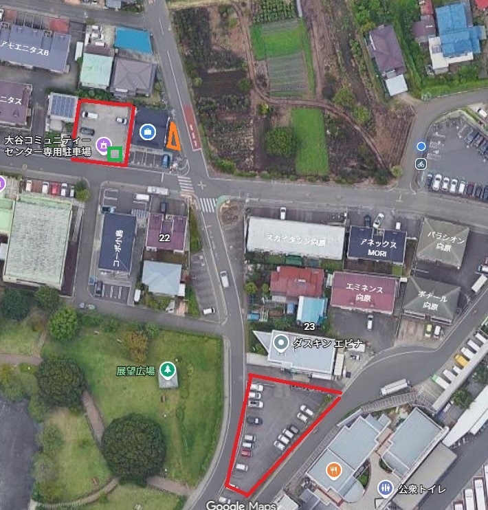 駐車場あり。海老名駅からのコミュニティセンターバスは大谷コミセン前で下車してください